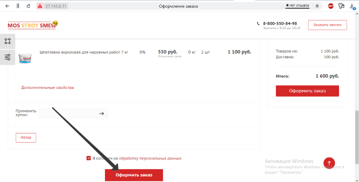 6. Проверяем содержимое корзины, введенные данные и нажимаем кнопку «Оформить заказ»